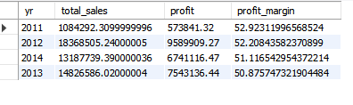 Although 2011 was the year with lowest sales and profit (because sales in 2011 only start in Q4 ), it has the highest profit margin 52.9%. This is an interesting insight that would require further investigation