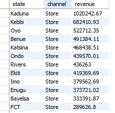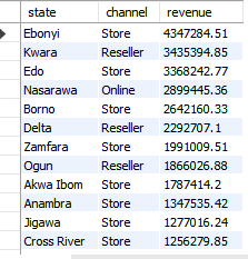 I needed another subquery here because a MAX(SUM()) function wouldn't work. So the result of the subquery contains the the sum of revenue for all channels across each state and the outer query uses the MAX() function to find the channel with the maximum revenue for each state. I used the ROUND() function to round the answer to 2 decimal places to make reading easier. We see the total revenue here again, which if you recall is the sum of the products of the unit price of all items and their order quantities