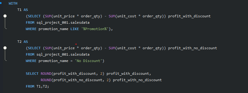 Again, I used a cte here which contained two select statements. I calculated for the profit and use the WHERE clause to filter the results on the promotion name field to find products and the corresponding promotion at the time of sale. And I do same for products with "no discount" in the promotion name field
