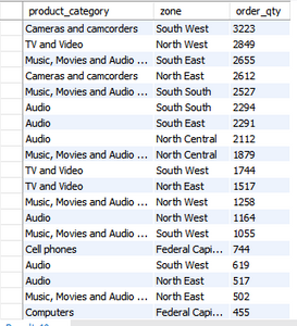 I used the ROW_NUMBER() window function to get the rank of the total revenue per product and zone and sorted it by the revenue in descending order with the "desc" function to get the highest revenues first. This produces a rank of all the revenues of all products. This is where the WHERE clause comes in and filters to show only revenues ranked from 1 to 10 based on the rank provided by the window function. The subquery on the FROM clause was necessary because without it I wouldn't be able to use the alias for the window function in the WHERE clause. Total revenue is absent in the table so I calculated it myself by summing up the products of the unit price and order quantity for each product. We will come across this multiple times in this project