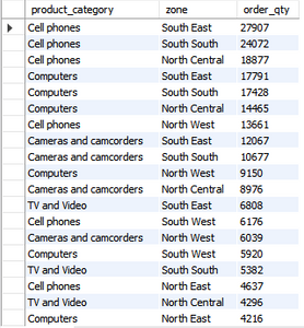 Just like in Q1, to answer this question I needed to add up all order quantities, group by the products, and find the products with the highest order quantity in each zone and year. Since the sum and max functions do not work together I first created a subquery to get the total order quantities of all products with the SUM() function in each zone in each year and used MAX() function in the outer query to find the products with the highest number of orders